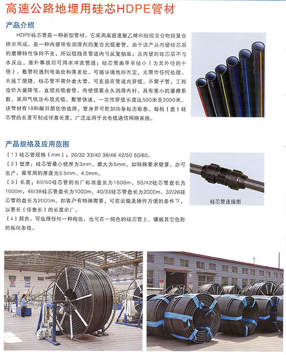 HDPE硅芯管是一种新型管材,它采用高密度聚乙烯和硅胶混合物经复合挤出而成,是一种内壁带有润滑剂和复合光缆套管,由于该产品内壁硅芯层的摩擦特性保持不变,所以缆线在管道内可反复...