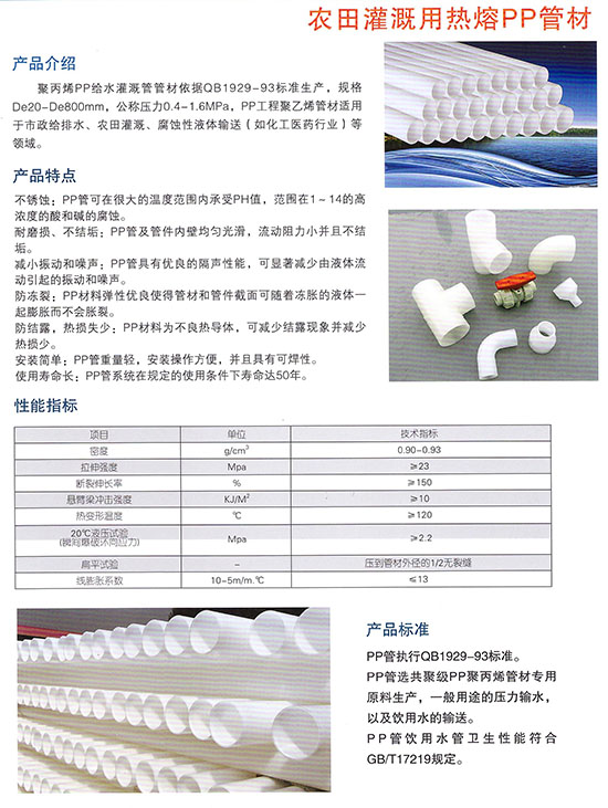 聚丙烯PP给水灌溉管材依据QB1929-93标准生产,规格De20-De800mm,公称压力0.4-1.6MPa,PP工程聚乙烯管材适用于市政给排水、农田灌溉、腐蚀性液体输送(如化工医药行业)等领域。...